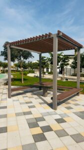 A bespoke WPC pergola installation at Yas Acres, Abu Dhabi, designed to elevate the outdoor living experience while meeting the highest standards of durability and aesthetics. The project demanded precision detailing, material excellence, and a finish that aligned with the architectural language of a premium residential community.